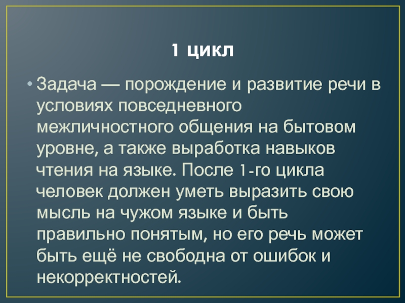 общения на бытовом уровне, а также выработка навыков чтения на языке. После 1-го цикла человек должен уметь выразить свою мысль на чужом языке и быть правильно понятым, но его речь может быть ещё не свободна от ошибок и некорректностей.