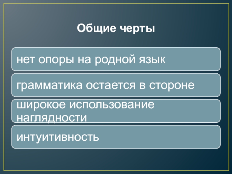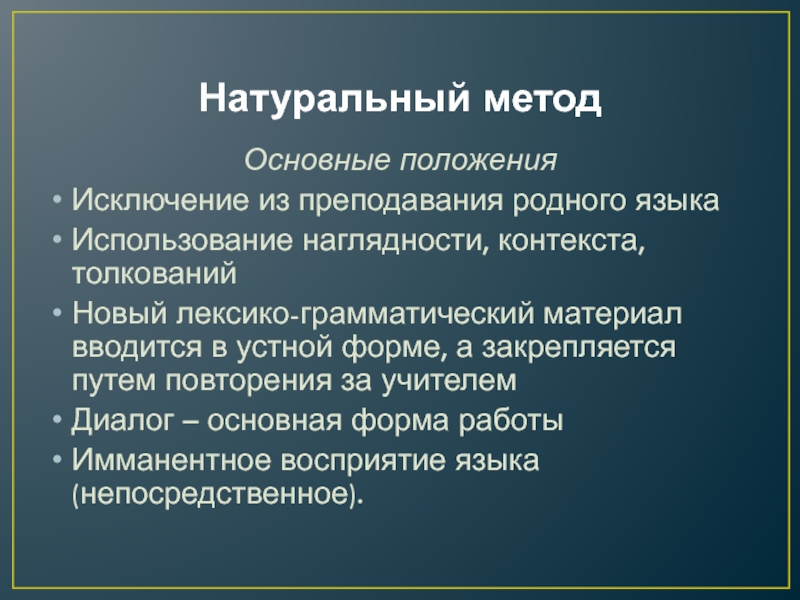 Натуральный метод Основные положенияИсключение из преподавания родного языкаИспользование наглядности, контекста, толкованийНовый лексико-грамматический материал вводится в устной форме,