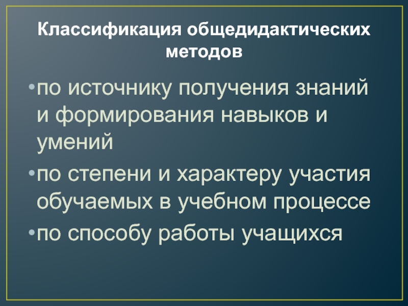 Классификация общедидактических методовпо источнику получения знаний и формирования навыков и уменийпо степени и характеру участия обучаемых в