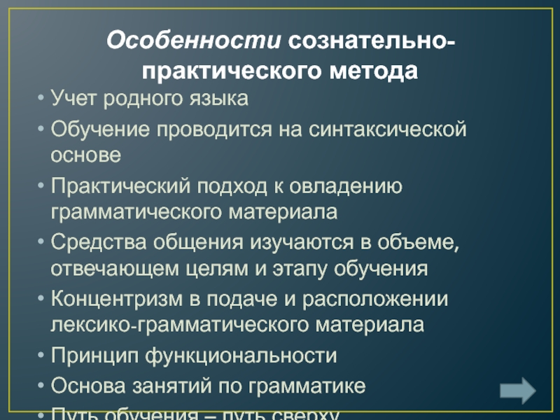 Особенности сознательно-практического методаУчет родного языкаОбучение проводится на синтаксической основеПрактический подход к овладению грамматического материалаСредства общения изучаются в