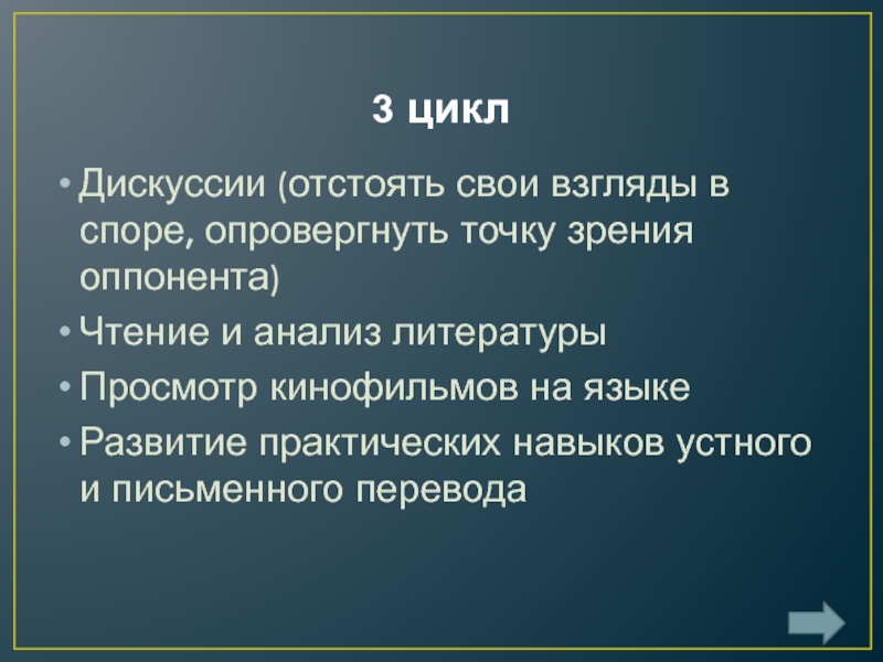 3 циклДискуссии (отстоять свои взгляды в споре, опровергнуть точку зрения оппонента)Чтение и анализ литературыПросмотр кинофильмов на языкеРазвитие
