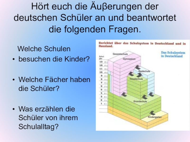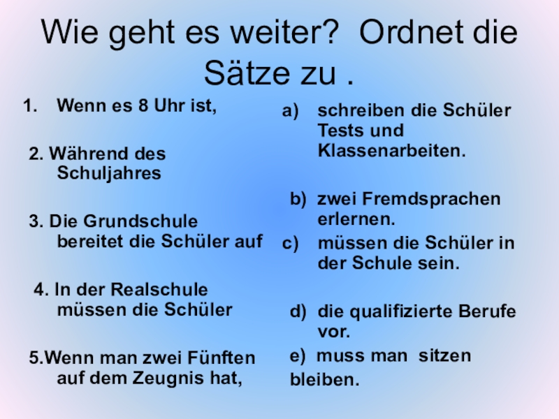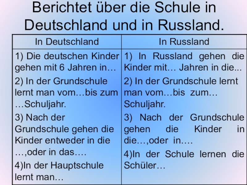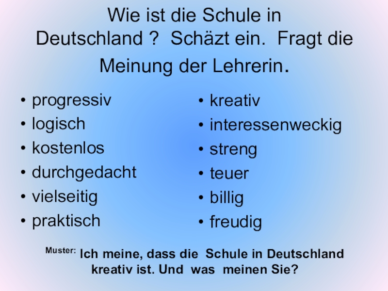 Muster: Ich meine, dass die Schule in Deutschland kreativ ist. Und was meinen Sie?