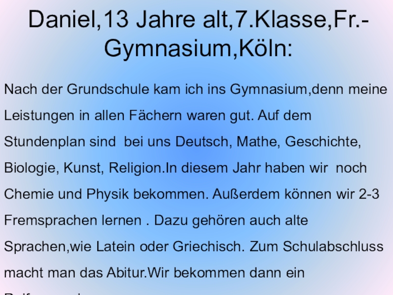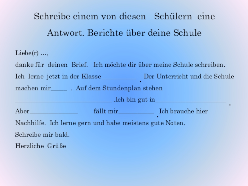 Schreibe einem von diesen Schülern eine Antwort. Berichte über deine Schule
