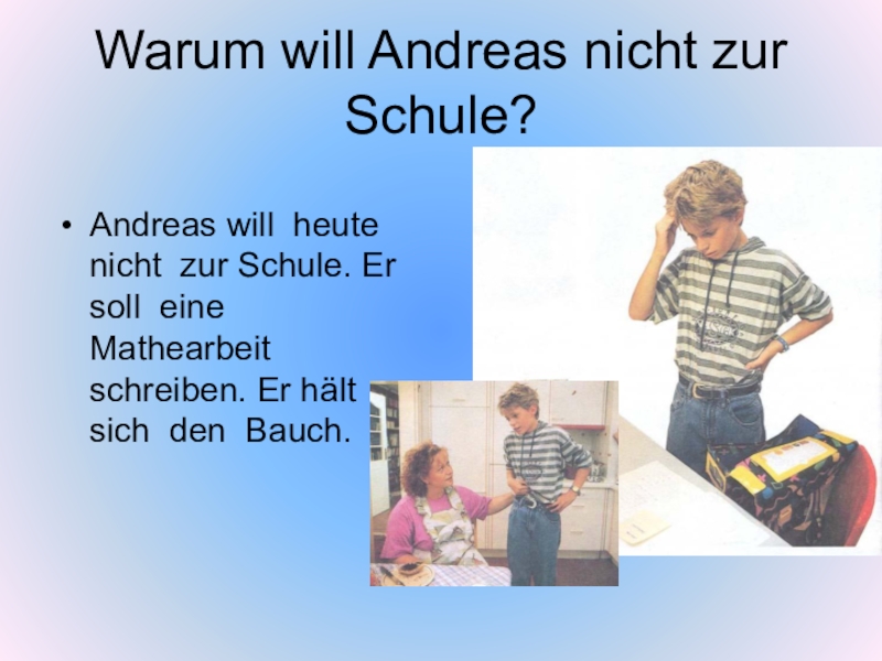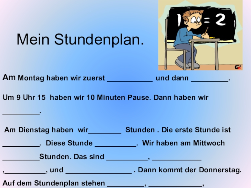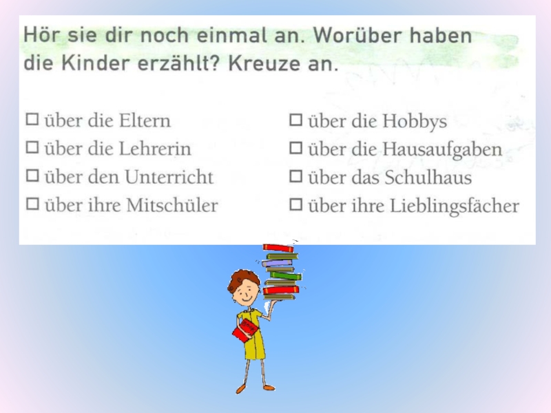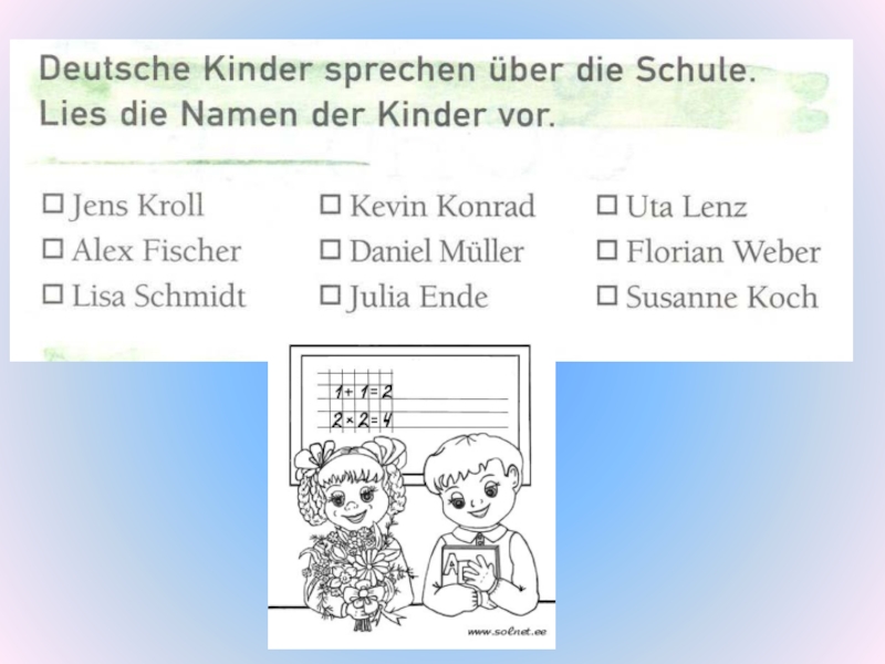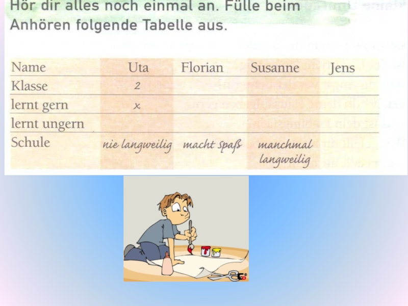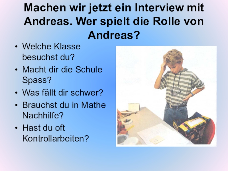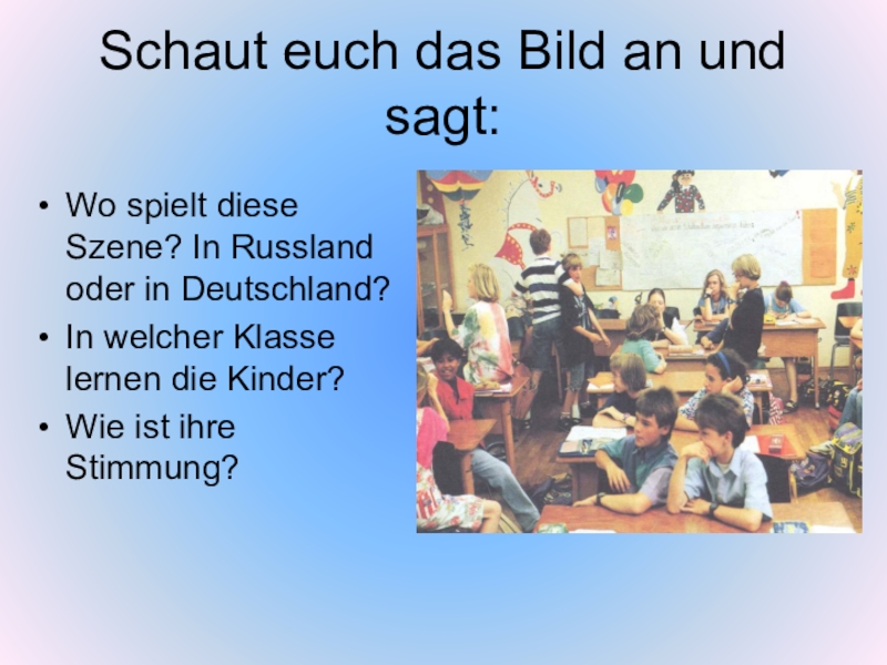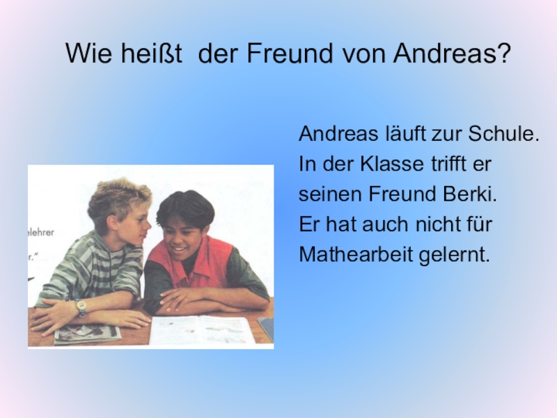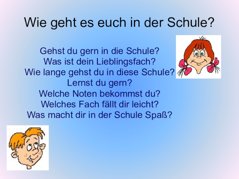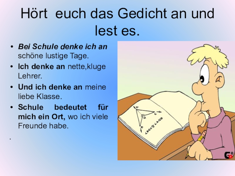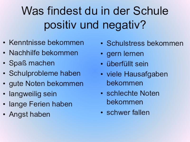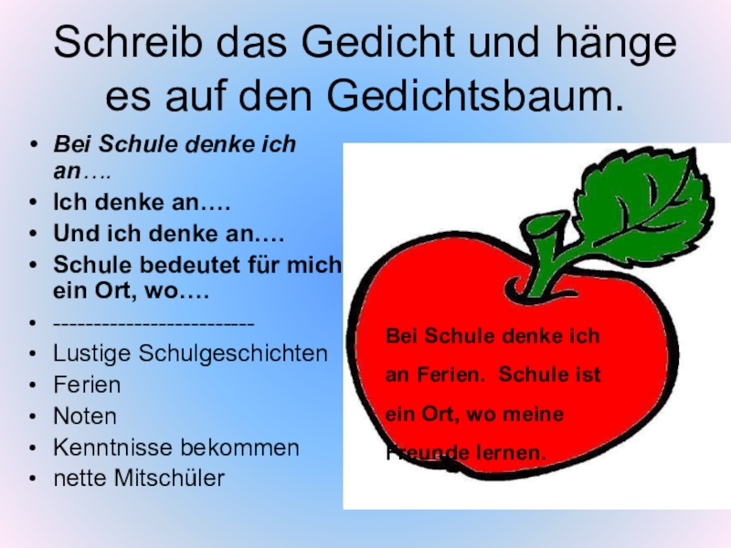 Bei Schule denke ich an Ferien. Schule ist ein Ort, wo meine Freunde lernen.