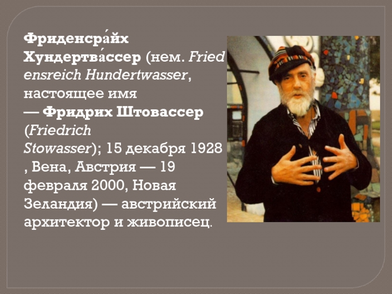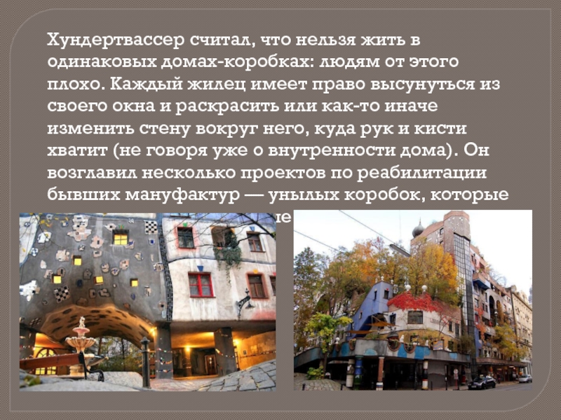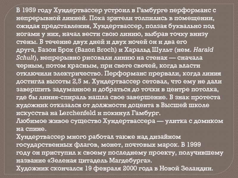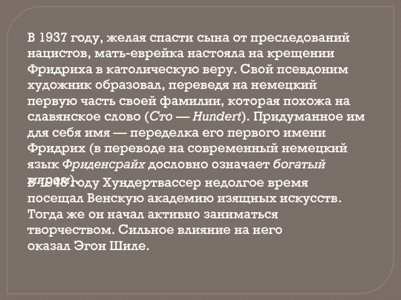 В 1948 году Хундертвассер недолгое время посещал Венскую академию изящных искусств. Тогда же он начал активно заниматься творчеством. Сильное влияние на него оказал Эгон Шиле.