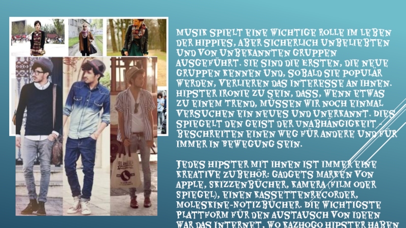 Слайд 5Musik spielt eine wichtige Rolle im Leben der Hippies, aber sicherlich