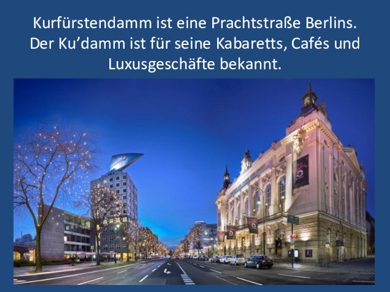 Слайд 8 Kurfürstendamm ist eine Prachtstraße Berlins. Der Ku’damm ist für seine Kabaretts,