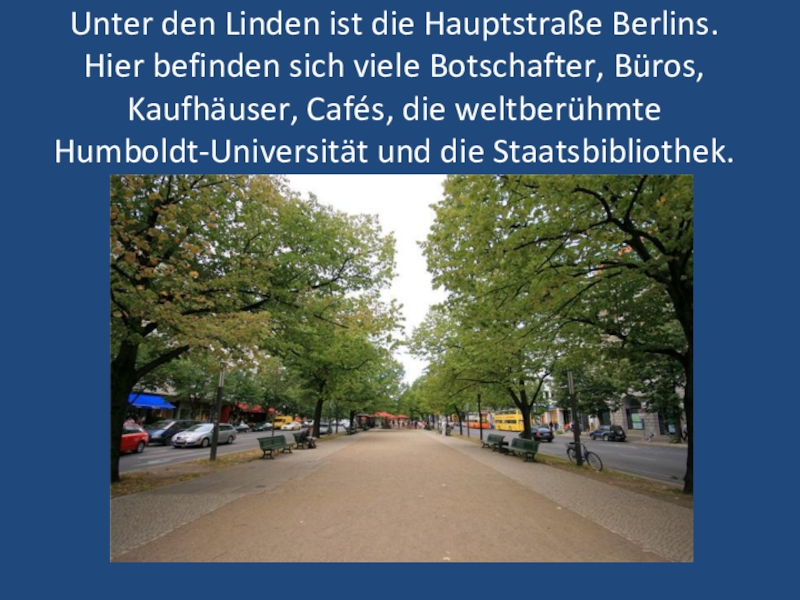 Unter den Linden ist die Hauptstraße Berlins. Hier befinden sich viele Botschafter, Büros, Kaufhäuser, Cafés, die weltberühmte