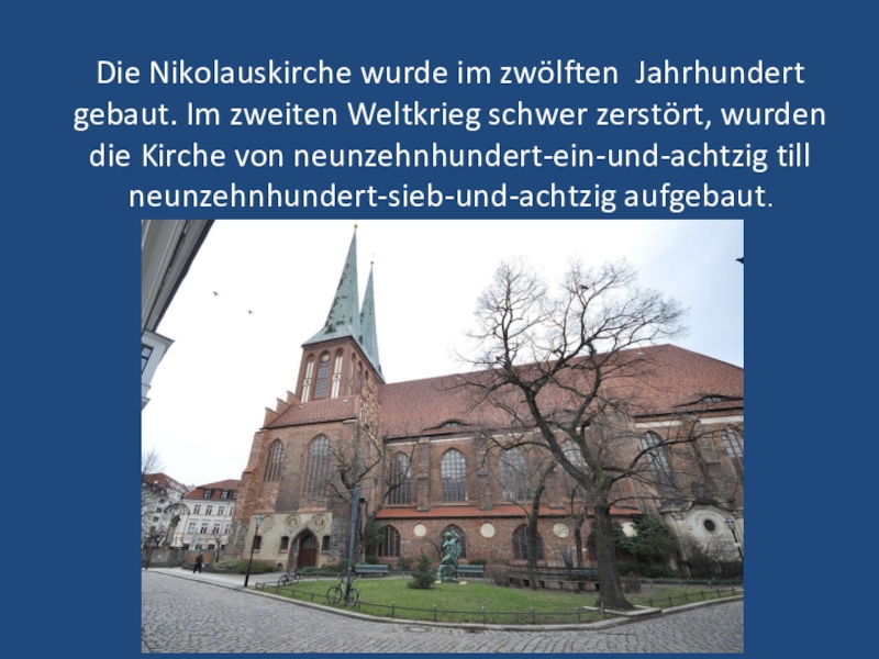 Слайд 5Die Nikolauskirche wurde im zwölften  Jahrhundert gebaut. Im zweiten Weltkrieg schwer zerstört,