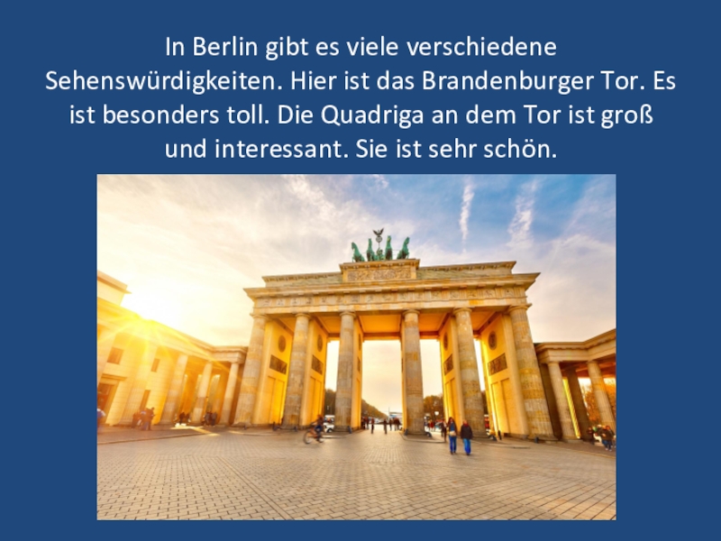 Слайд 3In Berlin gibt es viele verschiedene Sehenswürdigkeiten. Hier ist das Brandenburger