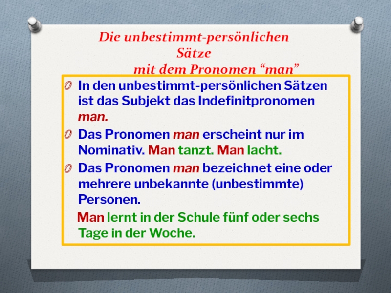 In den unbestimmt-persönlichen Sätzen ist das Subjekt das Indefinitpronomen man.