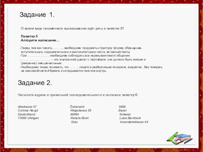 Напишите адреса в правильной последовательности и составьте памятку 6.