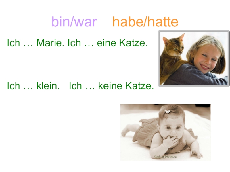 bin/war  habe/hatteIch … Marie. Ich … eine Katze.Ich … klein.  Ich … keine Katze.