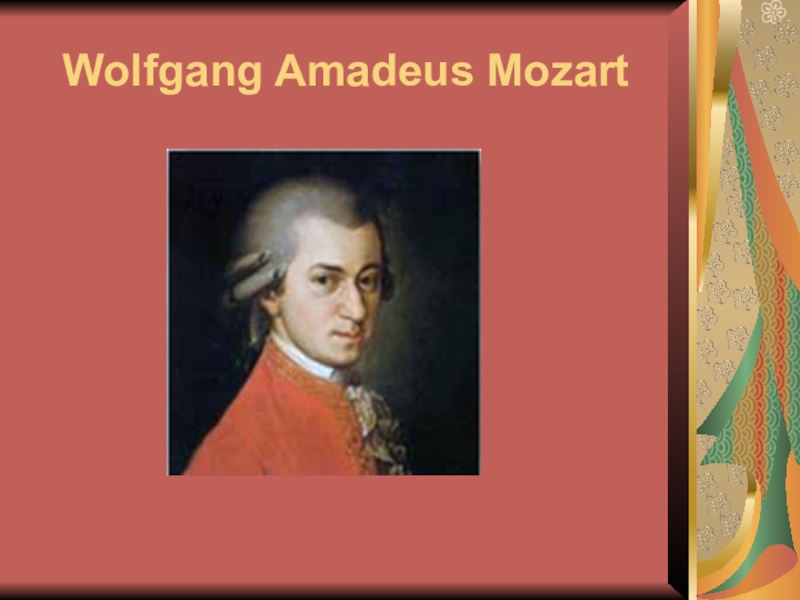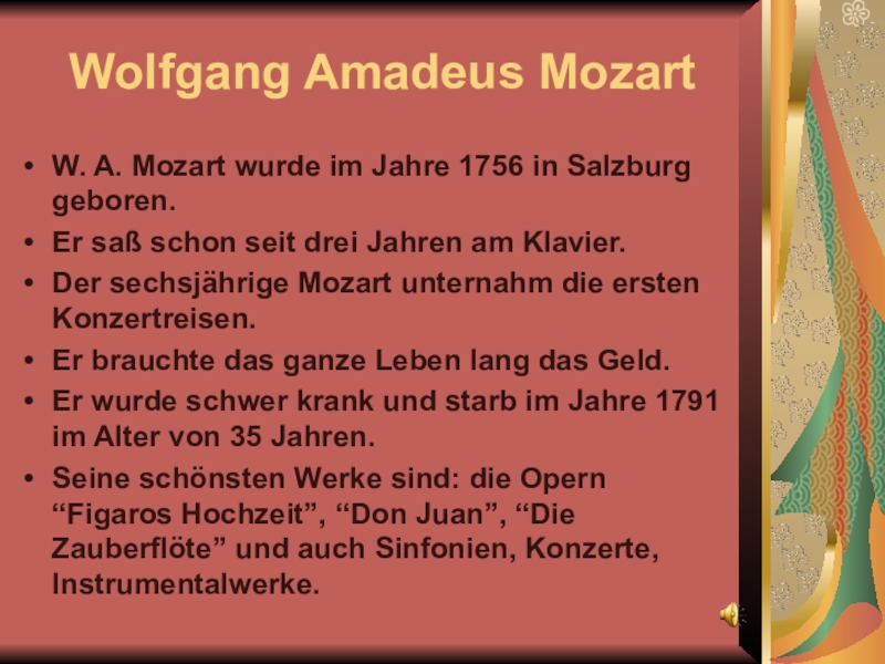 Seine schönsten Werke sind: die Opern “Figaros Hochzeit”, “Don Juan”, “Die Zauberflöte” und auch Sinfonien, Konzerte, Instrumentalwerke.