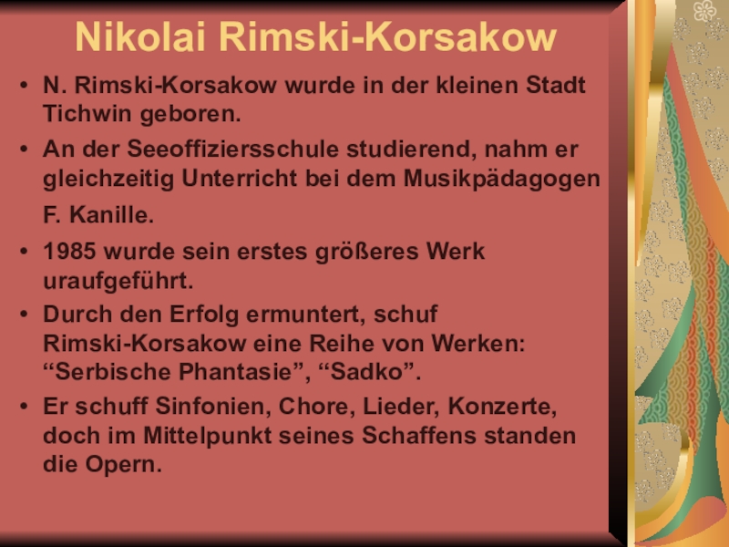 N. Rimski-Korsakow wurde in der kleinen Stadt Tichwin geboren.