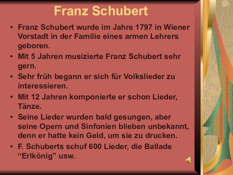 F. Schuberts schuf 600 Lieder, die Ballade “Erlkönig” usw.