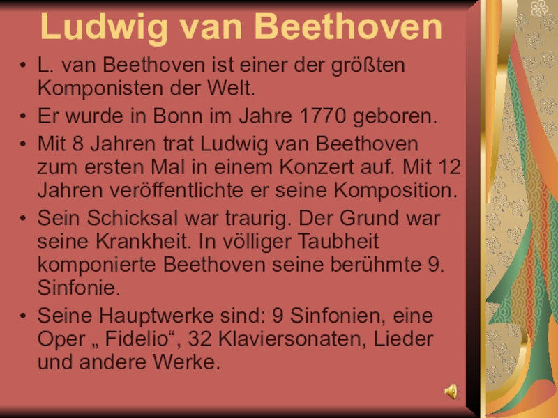 Sein Schicksal war traurig. Der Grund war seine Krankheit. In völliger Taubheit komponierte Beethoven seine berühmte 9. Sinfonie.