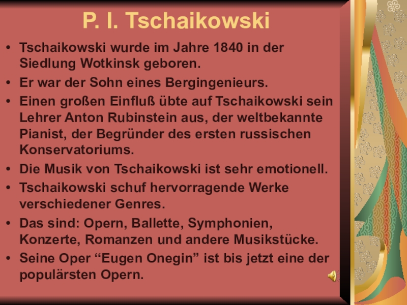 Tschaikowski schuf hervorragende Werke verschiedener Genres.