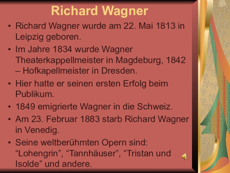 Seine weltberühmten Opern sind: “Lohengrin”, “Tannhäuser”, “Tristan und Isolde” und andere.