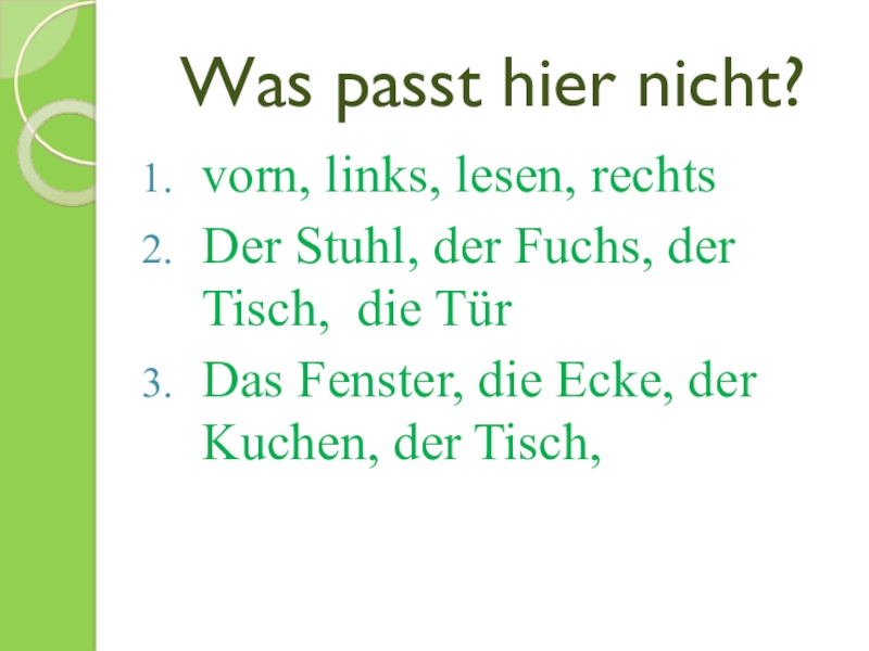 Was passt hier nicht?vorn, links, lesen, rechtsDer Stuhl, der Fuchs, der Tisch, die TürDas Fenster, die Ecke,