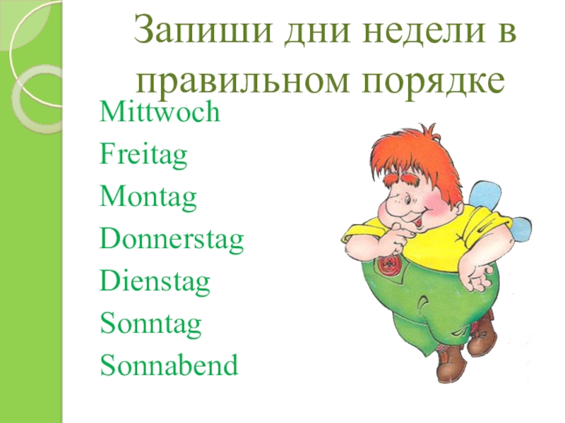 Запиши дни недели в правильном порядкеMittwochFreitagMontagDonnerstagDienstagSonntagSonnabend