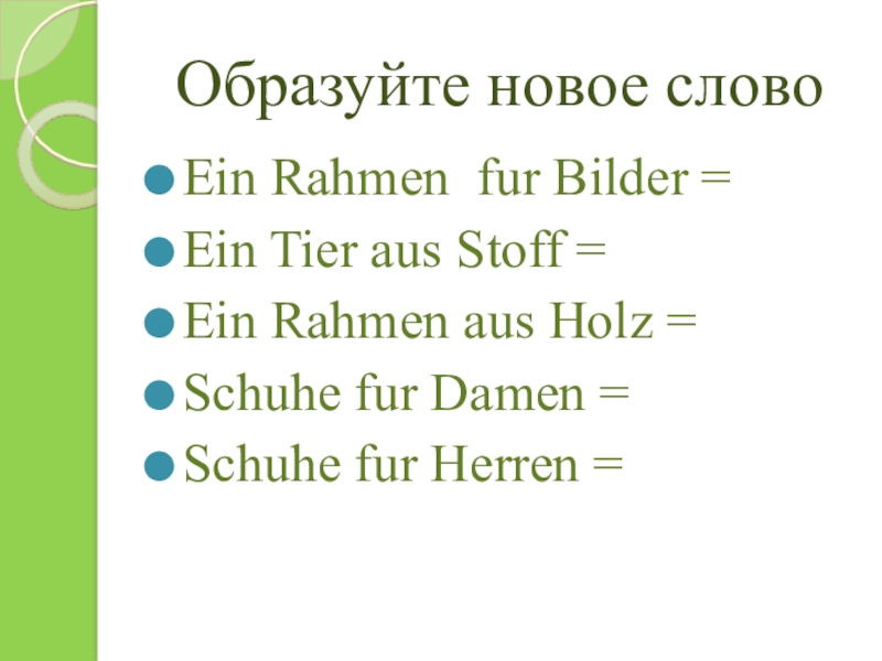Образуйте новое словоEin Rahmen fur Bilder =Ein Tier aus Stoff =Ein Rahmen aus Holz =Schuhe fur Damen