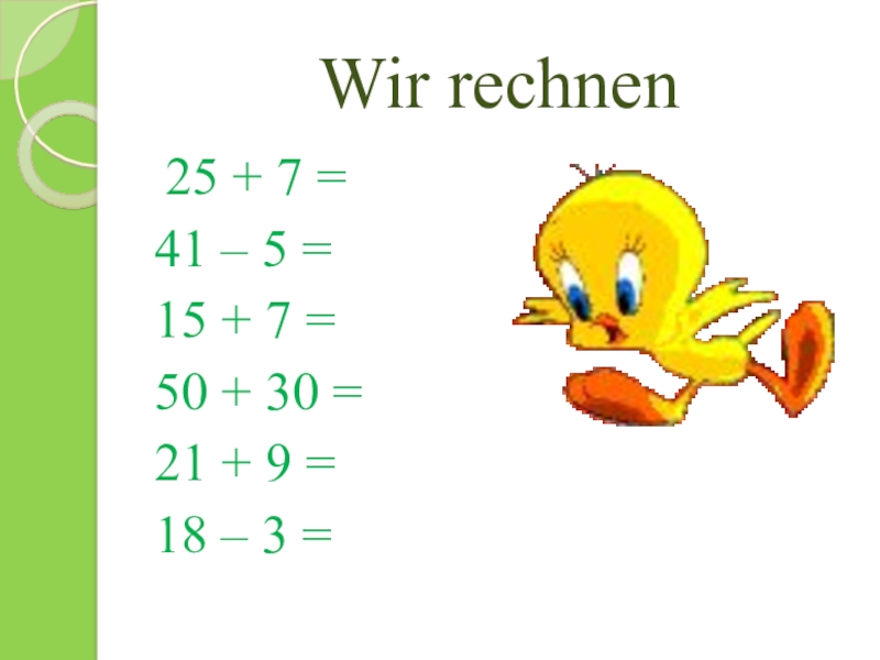 Wir rechnen 25 + 7 =41 – 5 =15 + 7 =50 + 30 =21 + 9