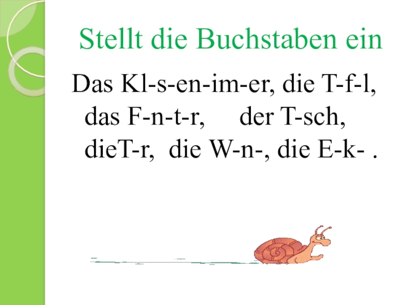 Stellt die Buchstaben einDas Kl-s-en-im-er, die T-f-l, das F-n-t-r,   der T-sch, dieT-r, die W-n-, die