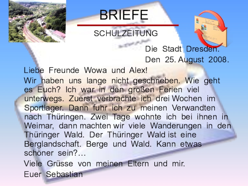 Wir haben uns lange nicht geschrieben. Wie geht es Euch? Ich war in den großen Ferien viel unterwegs. Zuerst verbrachte ich drei Wochen im Sportlager. Dann fuhr ich zu meinen Verwandten nach Thüringen. Zwei Tage wohnte ich bei ihnen in Weimar, dann machten wir viele Wanderungen in den Thüringer Wald. Der Thüringer Wald ist eine Berglandschaft. Berge und Wald. Kann etwas schöner sein?…