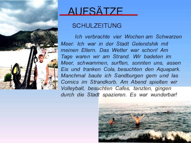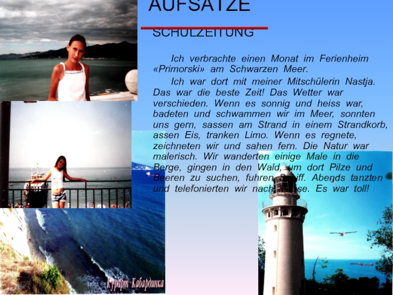 Ich war dort mit meiner Mitschülerin Nastja. Das war die beste Zeit! Das Wetter war verschieden. Wenn es sonnig und heiss war, badeten und schwammen wir im Meer, sonnten uns gern, sassen am Strand in einem Strandkorb, assen Eis, tranken Limo. Wenn es regnete, zeichneten wir und sahen fern. Die Natur war malerisch. Wir wanderten einige Male in die Berge, gingen in den Wald, um dort Pilze und Beeren zu suchen, fuhren Schiff. Abends tanzten und telefonierten wir nach Hause. Es war toll!