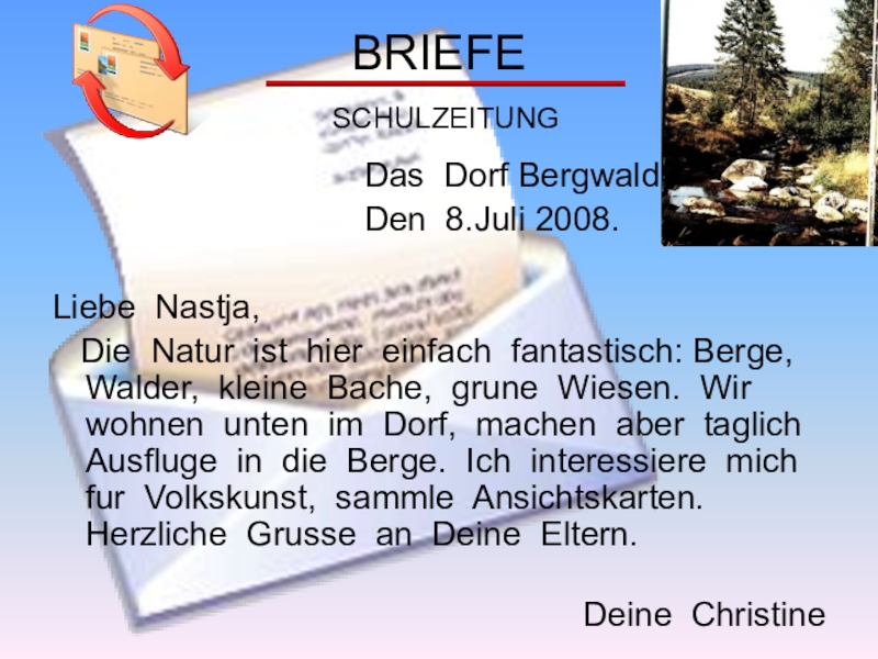 Die Natur ist hier einfach fantastisch: Berge, Walder, kleine Bache, grune Wiesen. Wir wohnen unten im Dorf, machen aber taglich Ausfluge in die Berge. Ich interessiere mich fur Volkskunst, sammle Ansichtskarten. Herzliche Grusse an Deine Eltern.