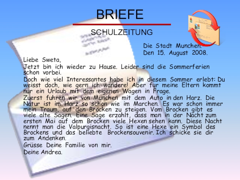 Zuerst fuhren wir von Munchen mit dem Auto in den Harz. Die Natur ist im Harz so schon wie im Marchen. Es war schon immer mein Traum, auf den Brocken zu steigen. Vom Brocken gibt es viele alte Sagen. Eine Sage erzahlt, dass man in der Nacht zum ersten Mai auf dem Brocken viele Hexen sehen kann. Diese Nacht nennt man die Valpurgisnacht. So ist eine Hexe ein Symbol des Brockens und das beliebte Brockensouvenir. Ich schicke sie dir zum Andenken.