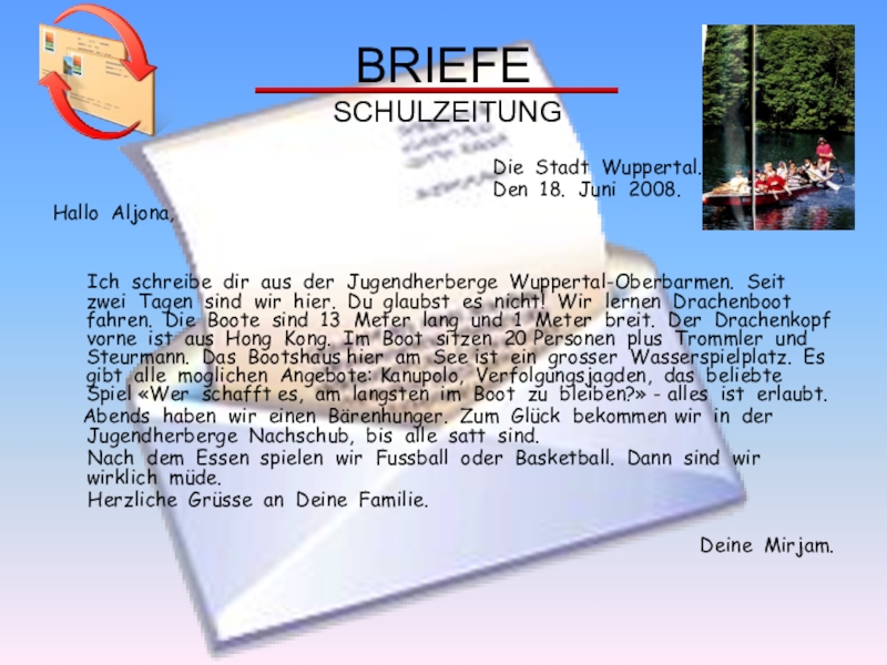 Ich schreibe dir aus der Jugendherberge Wuppertal-Oberbarmen. Seit zwei Tagen sind wir hier. Du glaubst es nicht! Wir lernen Drachenboot fahren. Die Boote sind 13 Meter lang und 1 Meter breit. Der Drachenkopf vorne ist aus Hong Kong. Im Boot sitzen 20 Personen plus Trommler und Steurmann. Das Bootshaus hier am See ist ein grosser Wasserspielplatz. Es gibt alle moglichen Angebote: Kanupolo, Verfolgungsjagden, das beliebte Spiel «Wer schafft es, am langsten im Boot zu bleiben?» - alles ist erlaubt.