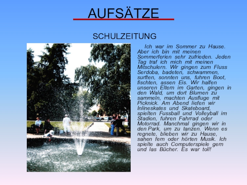 zu Hause. Aber ich bin mit meinen Sommerferien sehr zufrieden. Jeden Tag traf ich mich mit meinen Mitschulern. Wir gingen zum Fluss Serdoba, badeten, schwammen, surften, sonnten uns, fuhren Boot, fischten, assen Eis. Wir halfen unseren Eltern im Garten, gingen in den Wald, um dort Blumen zu sammeln, machten Ausfluge mit Picknick. Am Abend liefen wir Inlineskates und Skateboard, spielten Fussball und Volleyball im Stadion, fuhren Fahrrad oder Motorrad. Manchmal gingen wir in den Park, um zu tanzen. Wenn es regnete, blieben wir zu Hause, sahen fern oder hörten Musik. Ich spielte auch Computerspiele gern und las Bücher. Es war toll!