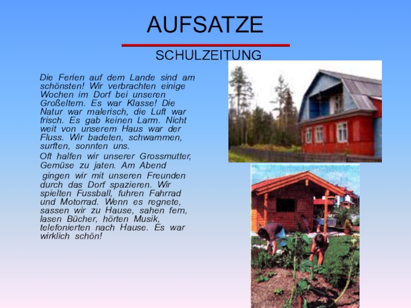 schönsten! Wir verbrachten einige Wochen im Dorf bei unseren Großeltern. Es war Klasse! Die Natur war malerisch, die Luft war frisch. Es gab keinen Larm. Nicht weit von unserem Haus war der Fluss. Wir badeten, schwammen, surften, sonnten uns.