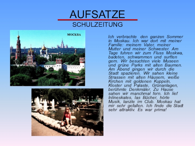 Ich war dort mit meiner Familie: meinem Vater, meiner Mutter und meiner Schwester. Am Tage fuhren wir zum Fluss Moskwa, badeten, schwammen und surften gern. Wir besuchten viele Museen und grüne Parks mit alten Baumen. Am Abend gingen wir durch die Stadt spazieren. Wir sahen kleine Strassen mit alten Häusern, weiße Kirchen mit goldenen Kuppeln, Kloster und Palaste, Grünanlagen, berühmte Denkmäler. Zu Hause sahen wir manchmal fern. Ich lief Inlineskates, las Bücher, hörte Musik, tanzte im Club. Moskau hat mir sehr gefallen. Ich finde die Stadt sehr attraktiv. Es war prima!
