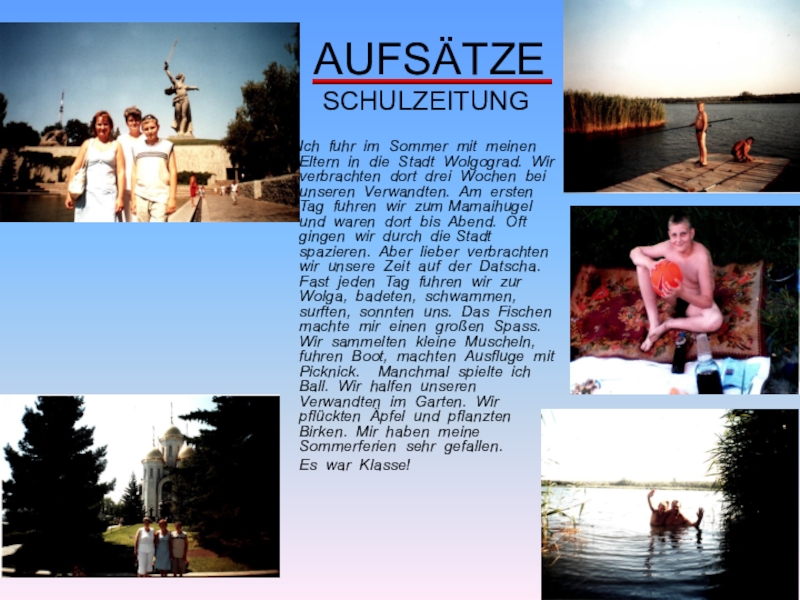 Ich fuhr im Sommer mit meinen Eltern in die Stadt Wolgograd. Wir verbrachten dort drei Wochen bei unseren Verwandten. Am ersten Tag fuhren wir zum Mamaihugel und waren dort bis Abend. Oft gingen wir durch die Stadt spazieren. Aber lieber verbrachten wir unsere Zeit auf der Datscha. Fast jeden Tag fuhren wir zur Wolga, badeten, schwammen, surften, sonnten uns. Das Fischen machte mir einen großen Spass. Wir sammelten kleine Muscheln, fuhren Boot, machten Ausfluge mit Picknick. Manchmal spielte ich Ball. Wir halfen unseren Verwandten im Garten. Wir pflückten Äpfel und pflanzten Birken. Mir haben meine Sommerferien sehr gefallen.