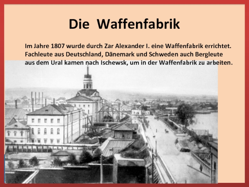Die Waffenfabrik Im Jahre 1807 wurde durch Zar Alexander I. eine Waffenfabrik errichtet. Fachleute aus Deutschland, Dänemark und Schweden