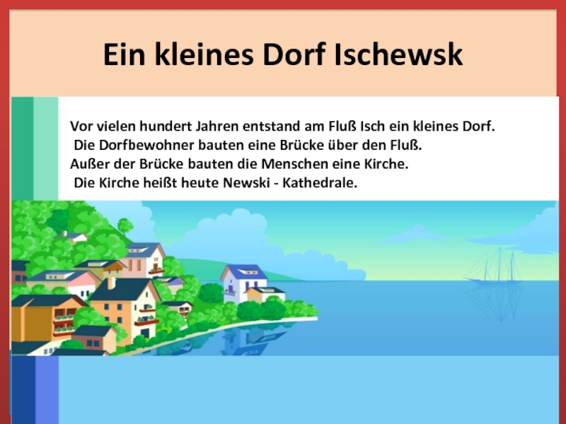 Ein kleines Dorf IschewskVor vielen hundert Jahren entstand am Fluß Isch ein kleines Dorf. Die Dorfbewohner bauten eine Brücke über den Fluß. Außer der Brücke bauten die Menschen eine Kirche. Die Kirche heißt heute Newski -