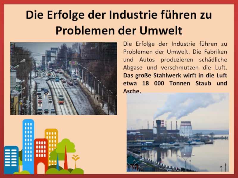 Industrie führen zu Problemen der Umwelt. Die Fabriken und Autos produzieren schädliche Abgase und verschmutzen die Luft. Das große Stahlwerk wirft in die Luft etwa 18 000 Tonnen Staub und Asche.