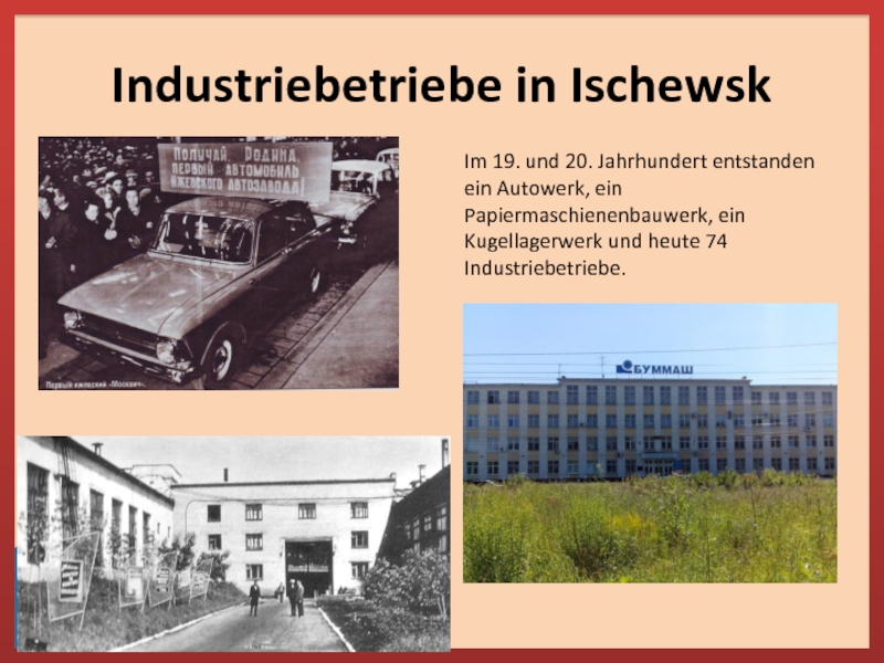Industriebetriebe in IschewskIm 19. und 20. Jahrhundert entstanden ein Autowerk, ein Papiermaschienenbauwerk, ein Kugellagerwerk und heute 74