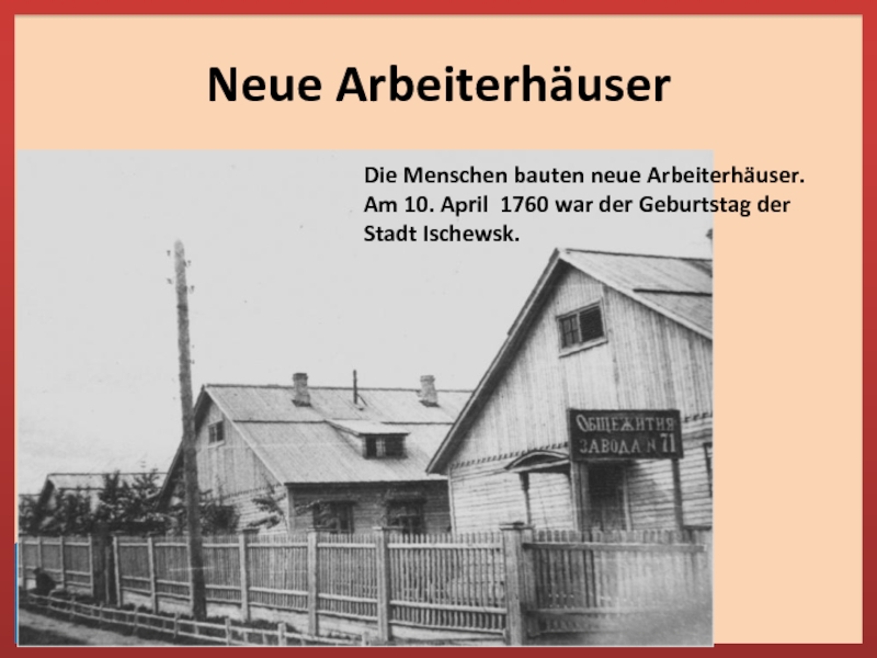 Neue ArbeiterhäuserDie Menschen bauten neue Arbeiterhäuser. Am 10. April 1760 war der Geburtstag der Stadt Ischewsk.