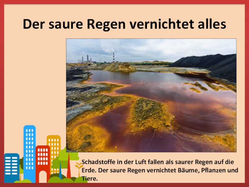 Der saure Regen vernichtet allesSchadstoffe in der Luft fallen als saurer Regen auf die Erde. Der saure
