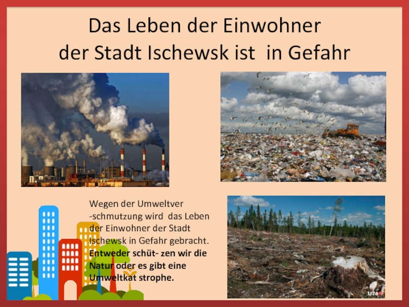 Umweltver -schmutzung wird das Leben der Einwohner der Stadt Ischewsk in Gefahr gebracht. Entweder schüt- zen wir die Natur oder es gibt eine Umweltkat strophe.