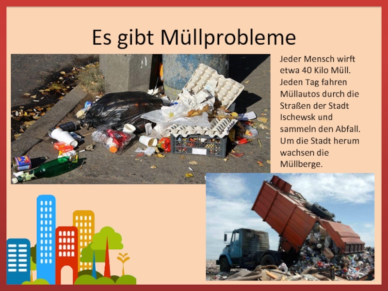 Es gibt MüllproblemeJeder Mensch wirft etwa 40 Kilo Müll. Jeden Tag fahren Müllautos durch die Straßen der