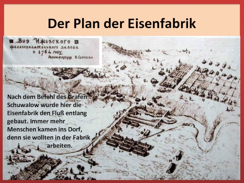 Der Plan der EisenfabrikNach dem Befehl des Grafen Schuwalow wurde hier die Eisenfabrik den Fluß entlang gebaut.