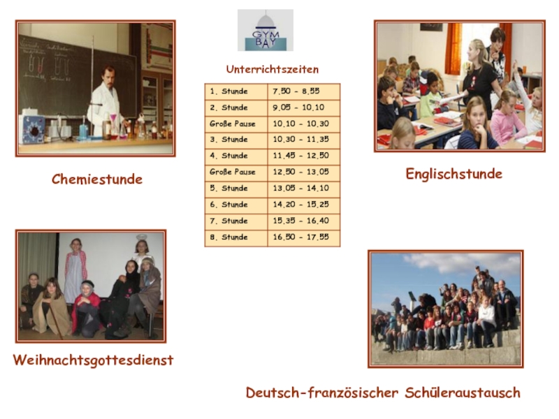 UnterrichtszeitenEnglischstundeChemiestundeDeutsch-französischer SchüleraustauschWeihnachtsgottesdienst