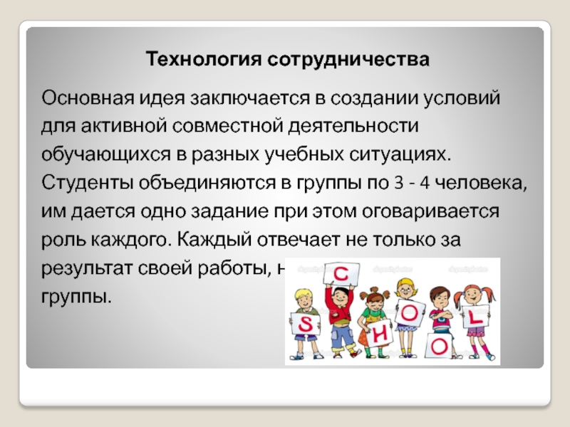 Технология сотрудничестваОсновная идея заключается в создании условий для активной совместной деятельности обучающихся в разных учебных ситуациях. Студенты