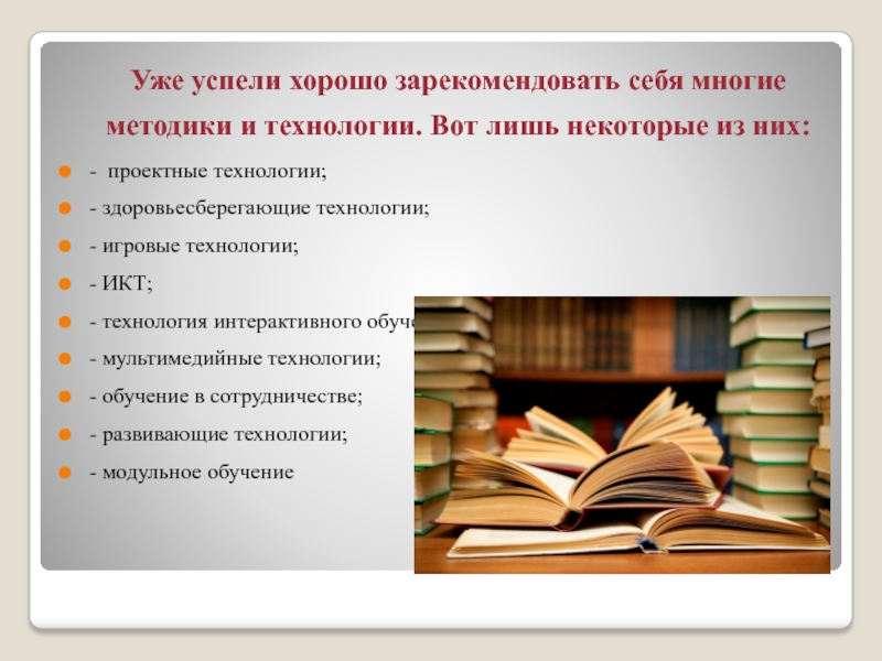 Слайд 4Уже успели хорошо зарекомендовать себя многие методики и технологии. Вот лишь