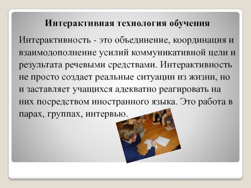 цели и результата речевыми средствами. Интерактивность не просто создает реальные ситуации из жизни, но и заставляет учащихся адекватно реагировать на них посредством иностранного языка. Это работа в парах, группах, интервью.